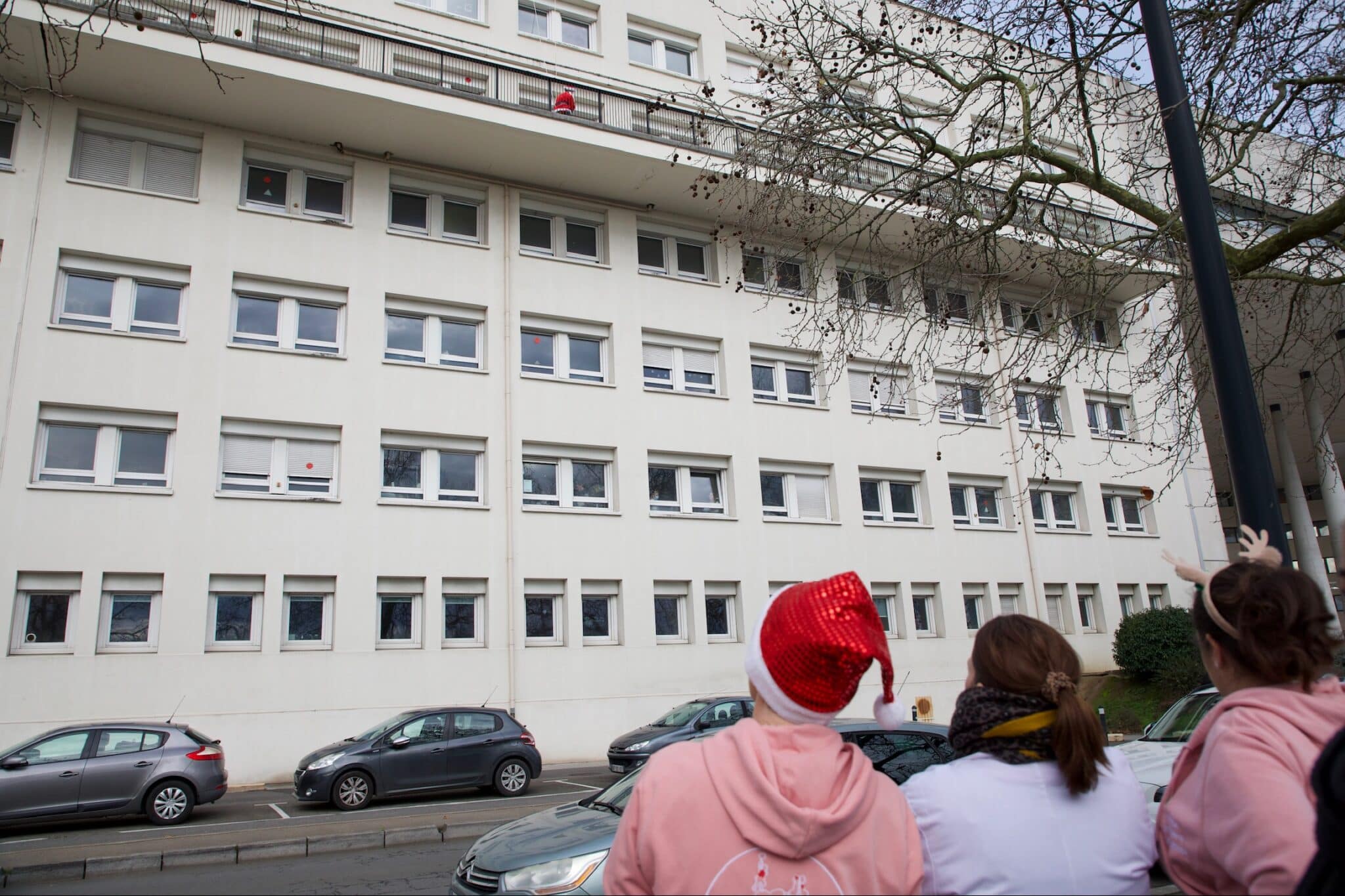 Félix Moreau et Donatien Bezier ont ainsi descendu en rappel les façades de l’Hôpital Femme-Enfant-Adolescent, passant sous les fenêtres des chambres pour saluer les enfants.